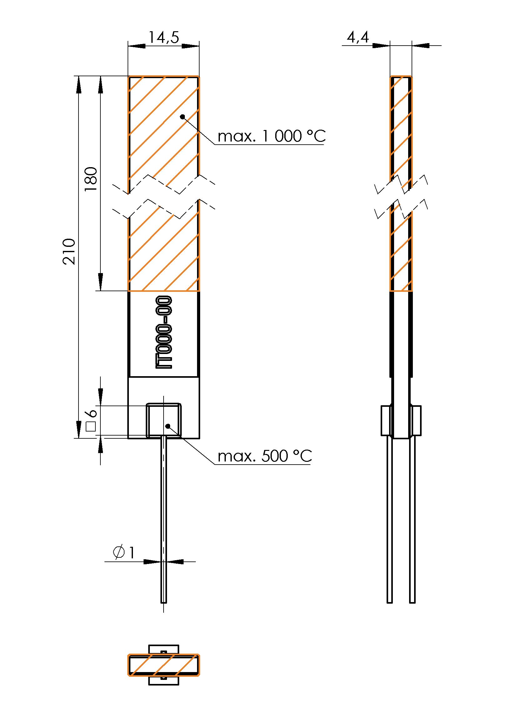 Das Heizelement besitzt eine Sackbohrung, in die ein Temperatursensor mit Ø1,0 mm z. B. ein