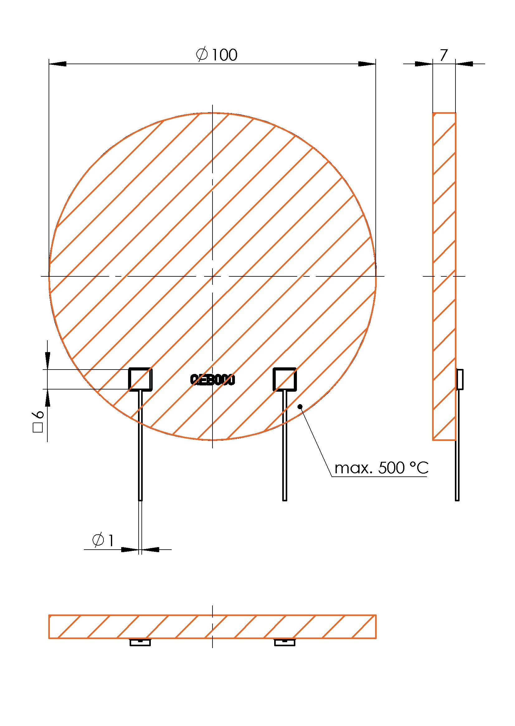 Mit einem Durchmesser von 100 mm eignet sich das Heizelement vom Typ QEB zur relativ großflächigen Erwärmung runder Körper. Die geringe Wärmedehnung von Siliziumnitrid hilft, dass auch bei 500 °C nur ein sehr geringer thermischer Verzug am Heizelement eintritt und die Wärmeübergangsfläche eben bleibt.